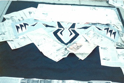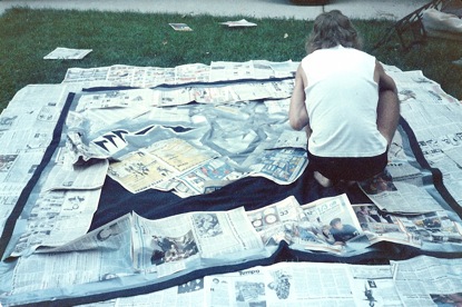 In the summer of 1985, Raven Bitch booked it’Äôs first shows with it’Äôs new lineup.  Not many clubs in Wisconsin were booking heavy metal bands at this time, so they promoted their own shows at a banquet hall, a local bowling alley, and at the Janesville 4th of July celebration where they had debuted a year before.  A mutual friend introduced Greg Kalember to Mark Worpel, guitarist for Milwaukee’Äôs Moxy Roxx in the summer of 1985.  Greg played him one of the band’Äôs basement practice tapes, and Mark agreed to let the young band open for his band at a couple of shows in the Milwaukee area.  After doing three very well received shows with Moxy Roxx, Raven Bitch was picked up by Moxy Roxx’Äôs booking agency and began to gig on a regular basis. Jim Beam paints the Raven Bitch backdrop.  Summer 1985. 1983 1986